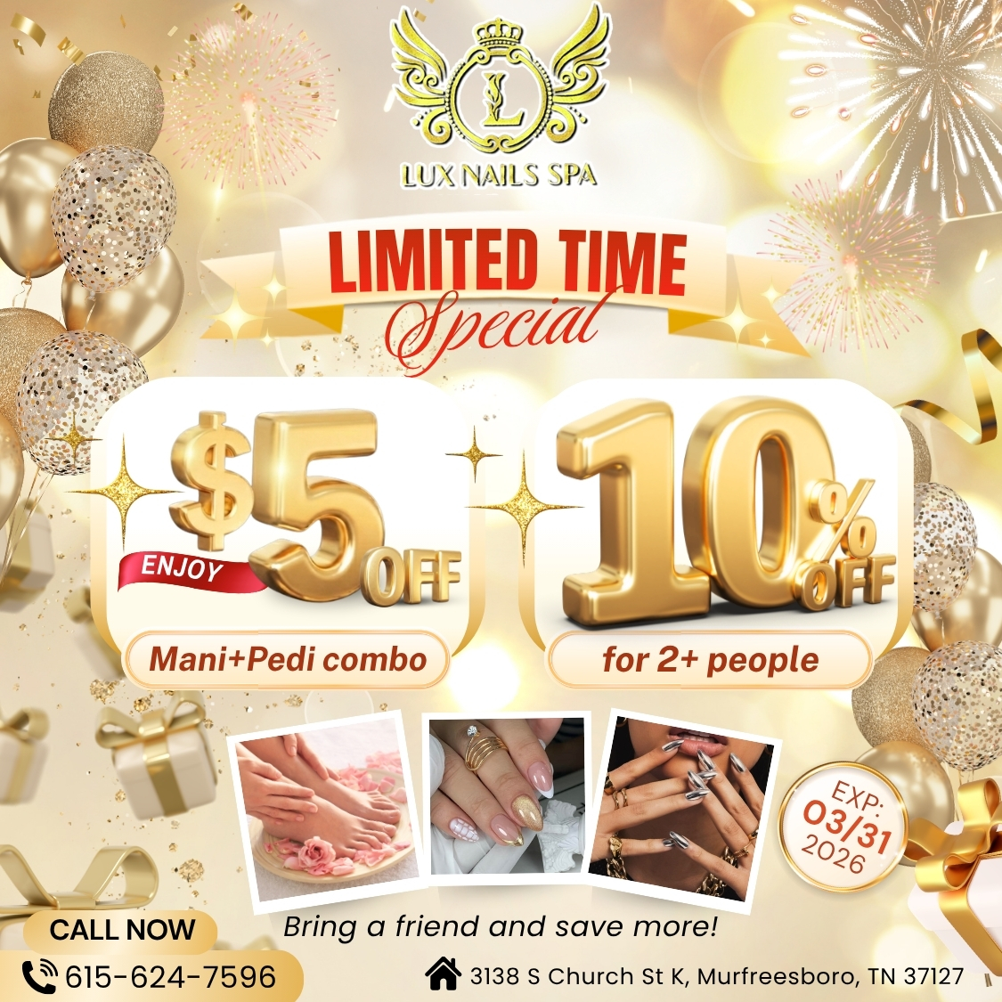 Are you looking for a reliable nail salon to perform nail and spa services? Look no further, Lux Nails Spa is the ideal location. Visit us at 3138 S Church St K, Murfreesboro, TN 37127, for beauty treatments and find yourself looking even more beautiful with a stylish look!